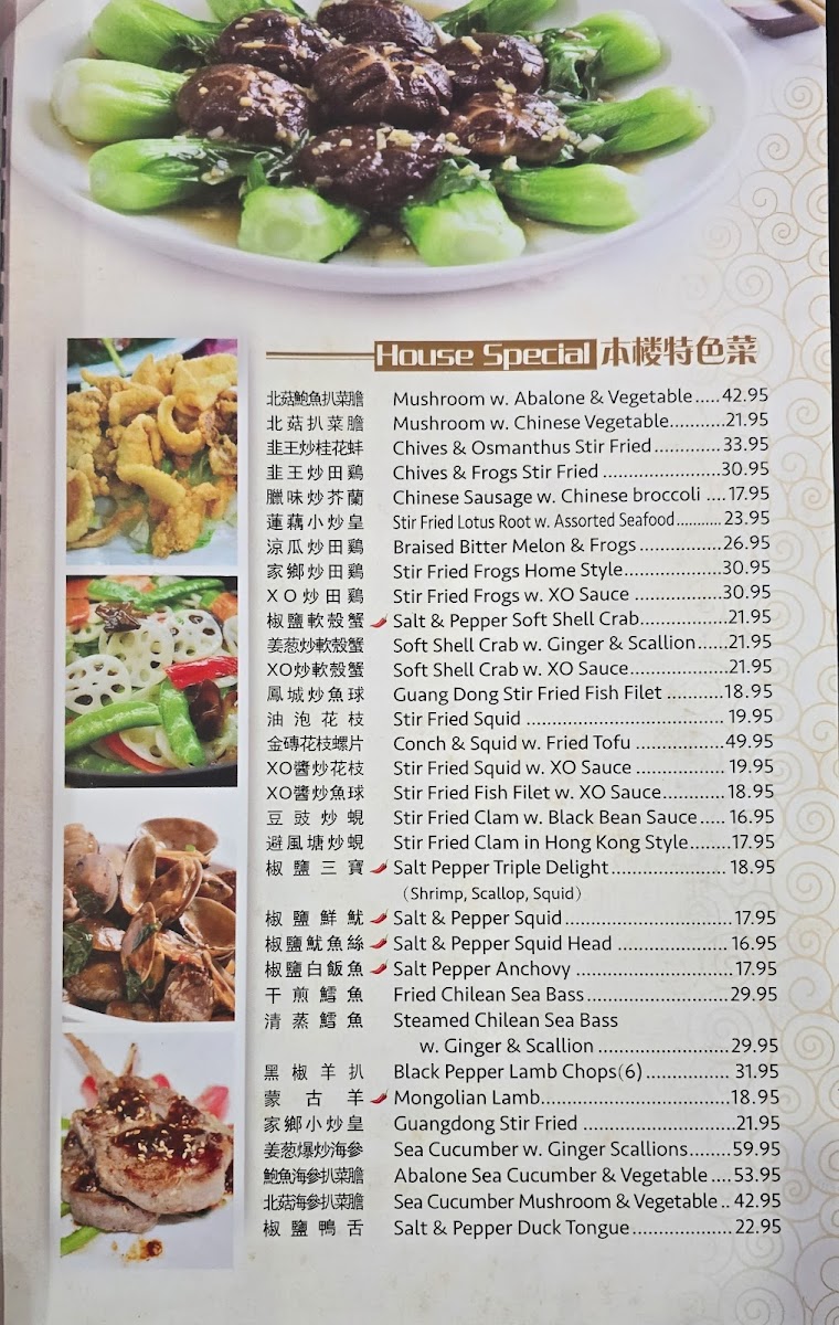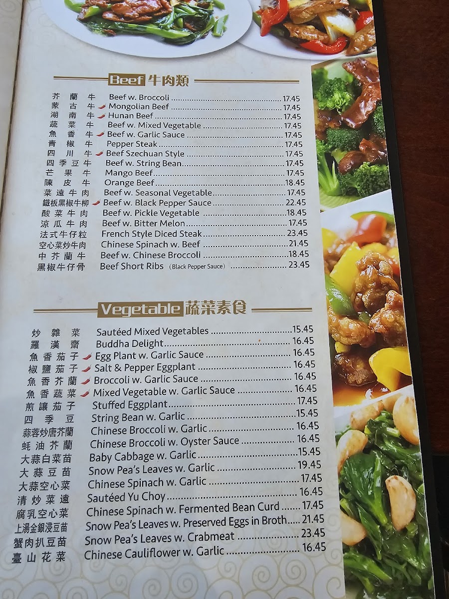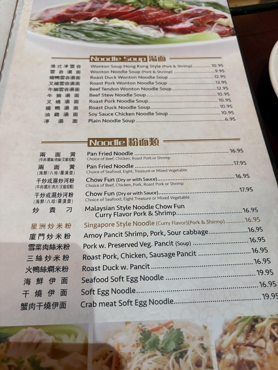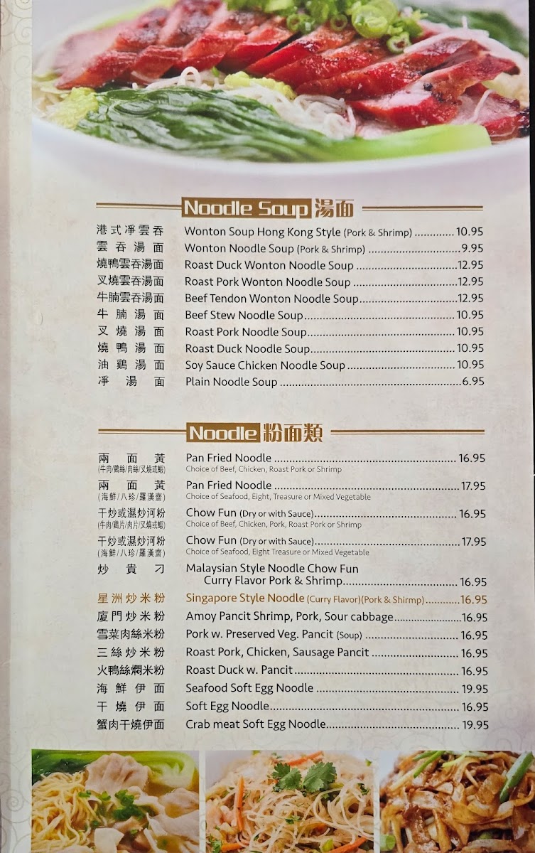 The menu offers a variety of traditional Chinese dishes, organized into categories such as soups, rice dishes, seafood, and dim sum. Visitors can find a selection of soups ranging from classic choices like Wonton Soup, Egg Drop Soup, and Hot & Sour Soup to more specialty options including Crab Meat with Fish Maw Soup and Beef Egg White Soup.