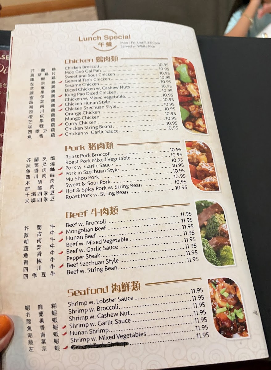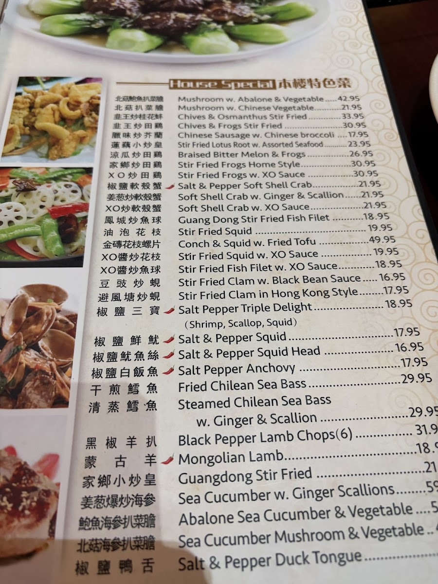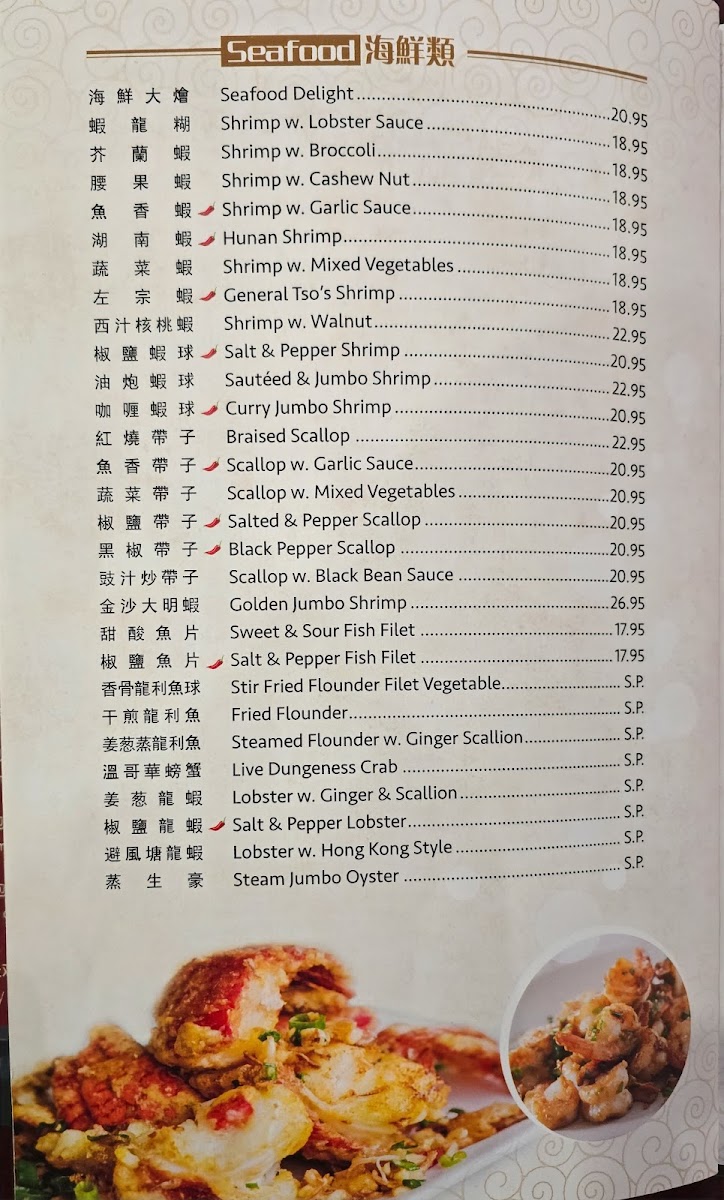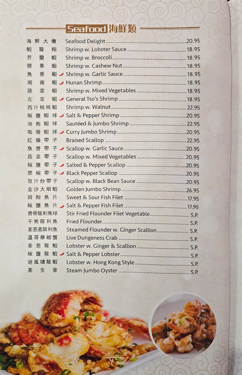 Seafood offerings include shrimp prepared in several styles such as Shrimp with Lobster Sauce, Honey Walnut Shrimp, General Tso's Shrimp, and Salt & Pepper Shrimp, alongside other seafood dishes. These are suitable for those seeking a variety of flavorful seafood plates.