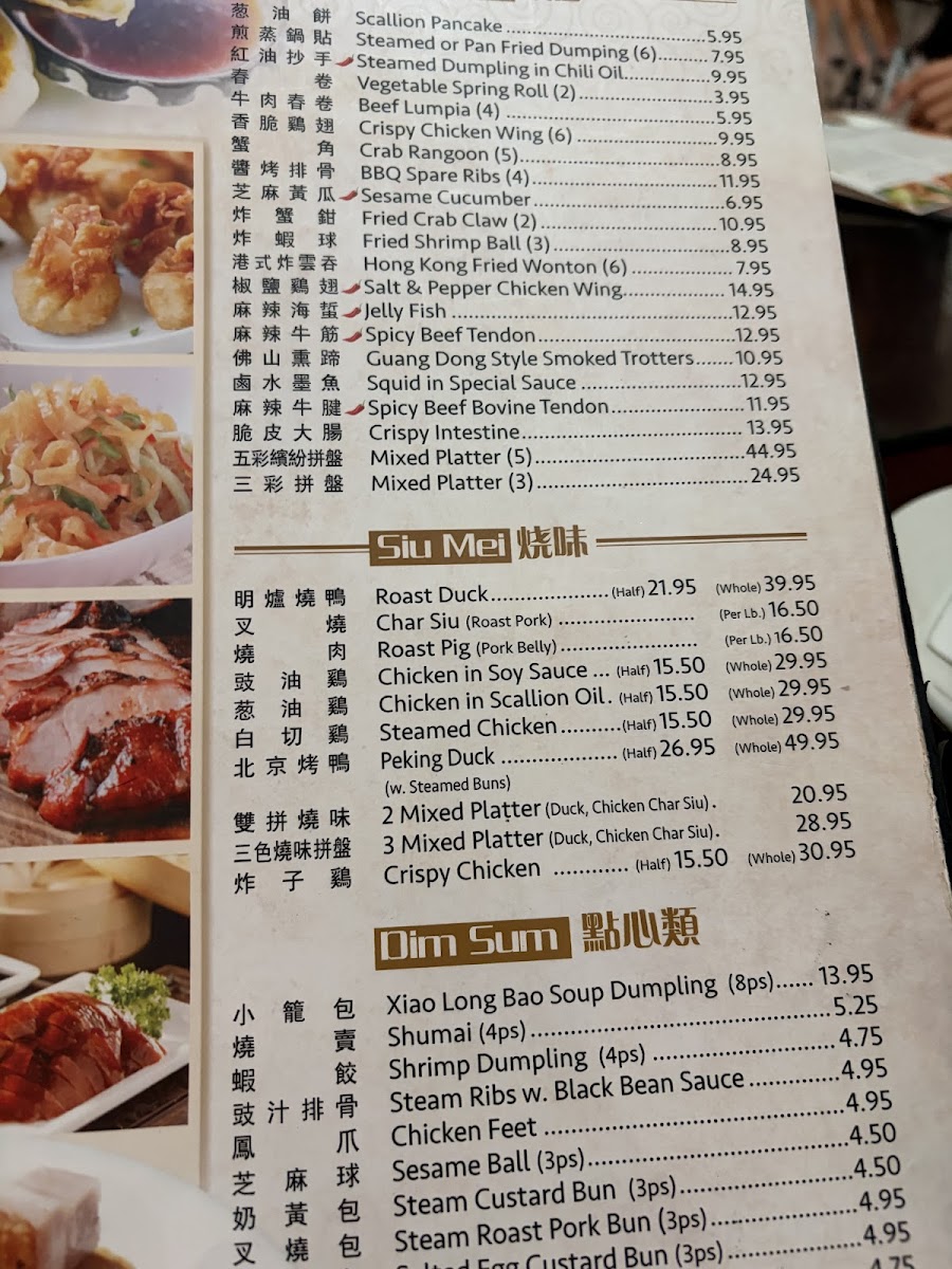 Dim sum items include traditional small bites like Chicken Feet, Pork Steamed Buns, Xiao Long Bao Soup Dumplings, and Clear Shrimp Dumplings, catering to guests interested in light or shareable dishes.