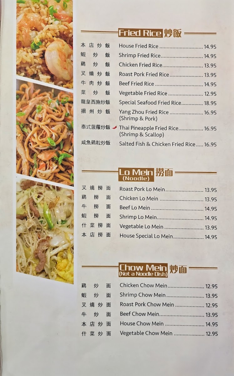 The rice dishes feature a range of options served over rice, including Roast Chicken, Duck, Roast Pork, and beef or vegetable combinations, providing a balanced selection for both individual and family-style meals.